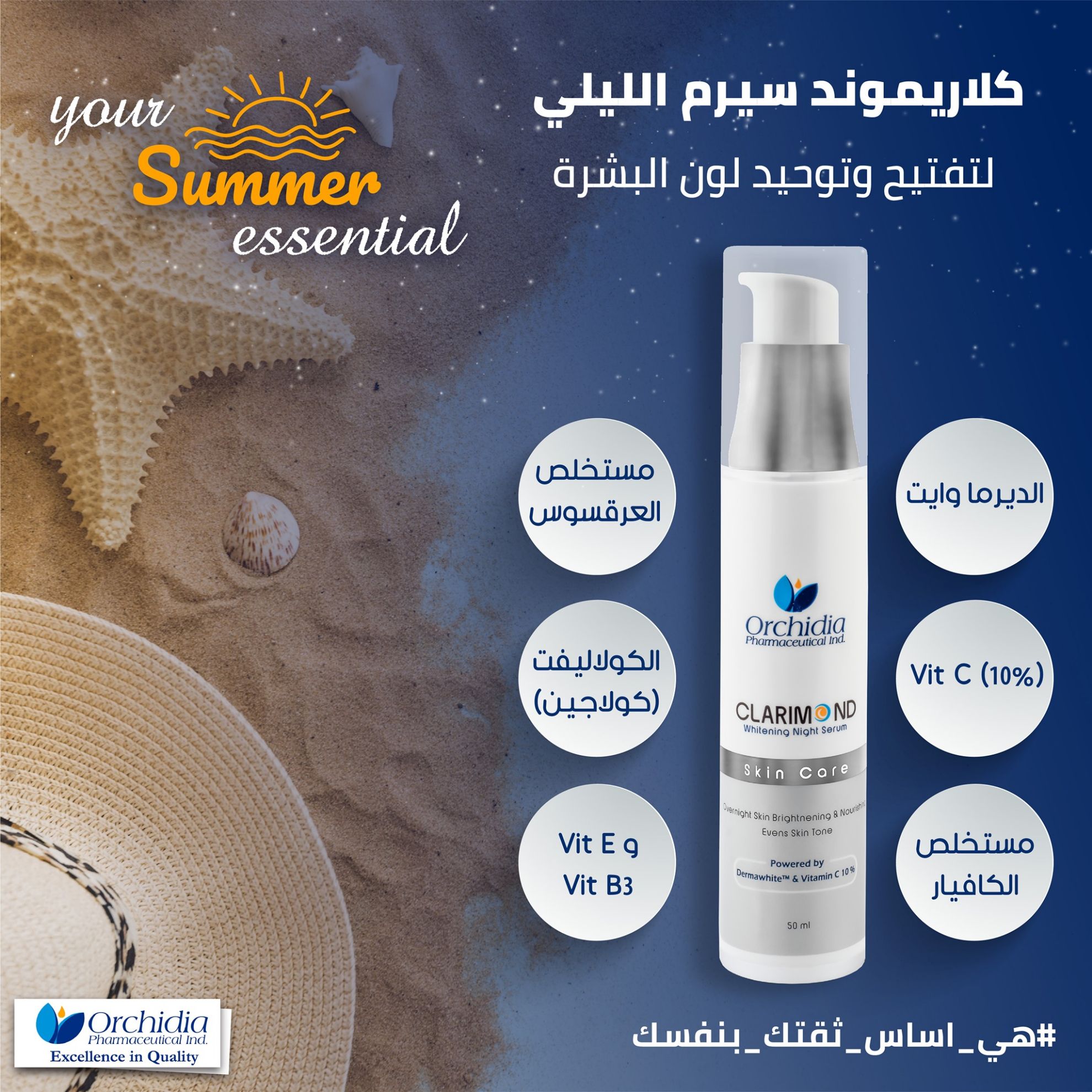 كلاريموند سيرم تفتيح الليلي هو منتج للعناية بالبشرة يستخدم لتفتيح البشرة وتحسين نسيجها وتقليل ظهور البقع الداكنة والهالات السوداء تحت العينين. يحتوي السيرم على مزيج من المكونات الفعالة التي تعمل على تفتيح البشرة وإزالة الشوائب وتحسين مظهرها.