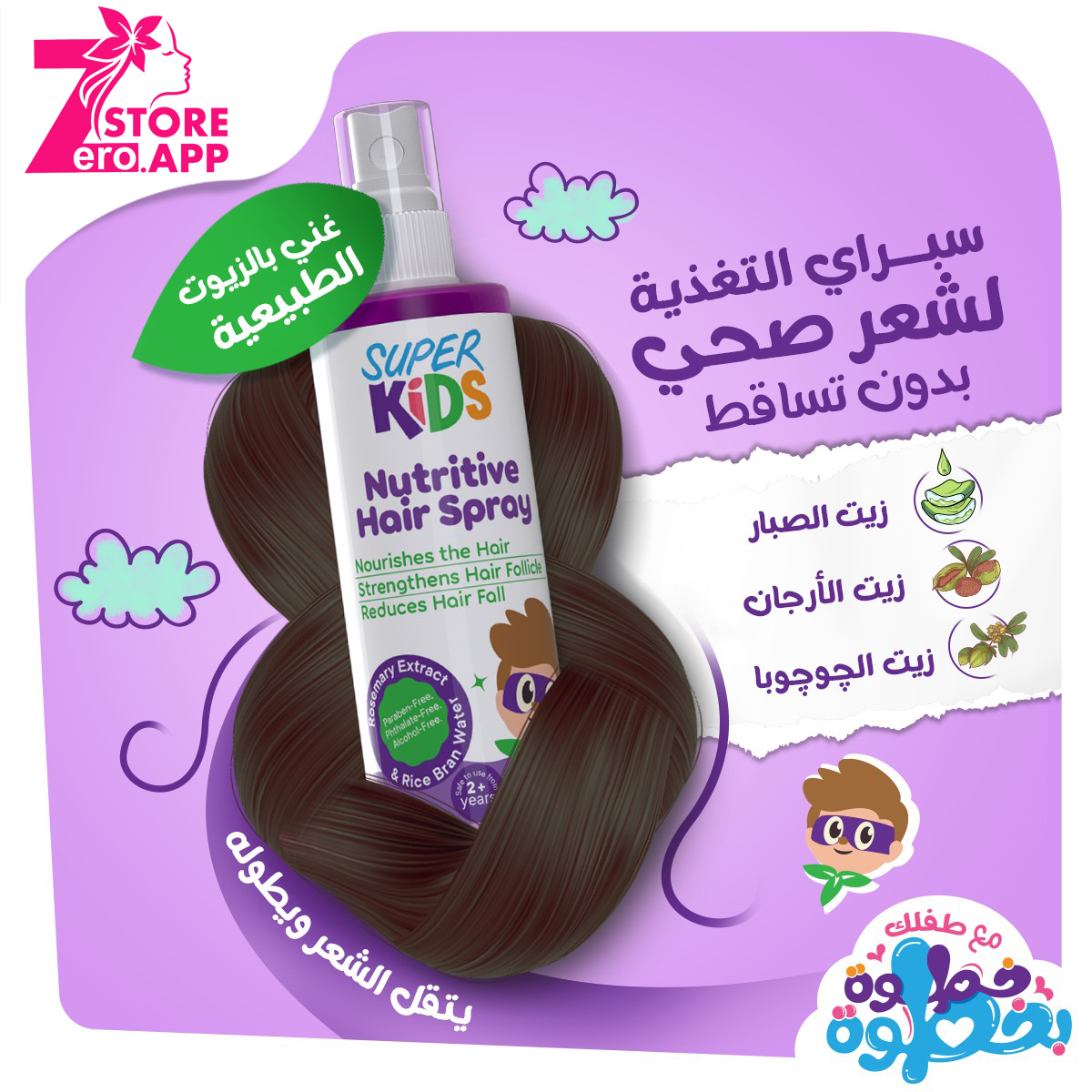 بخاخ فك تشابك الشعر من سوبر كيدز غني بالزيوت الطبيعية التي تنعم وتغذي وتصلح التموجات وتعزز اللمعان الطبيعي لشعر ناعم وصحي، خالٍ من البارابين. عطور صناعية وكبريتات، لا مزيد من التشابك أثناء التمشيط، ضعيه على الشعر الرطب أو الجاف قبل التمشيط حسب الحاجة