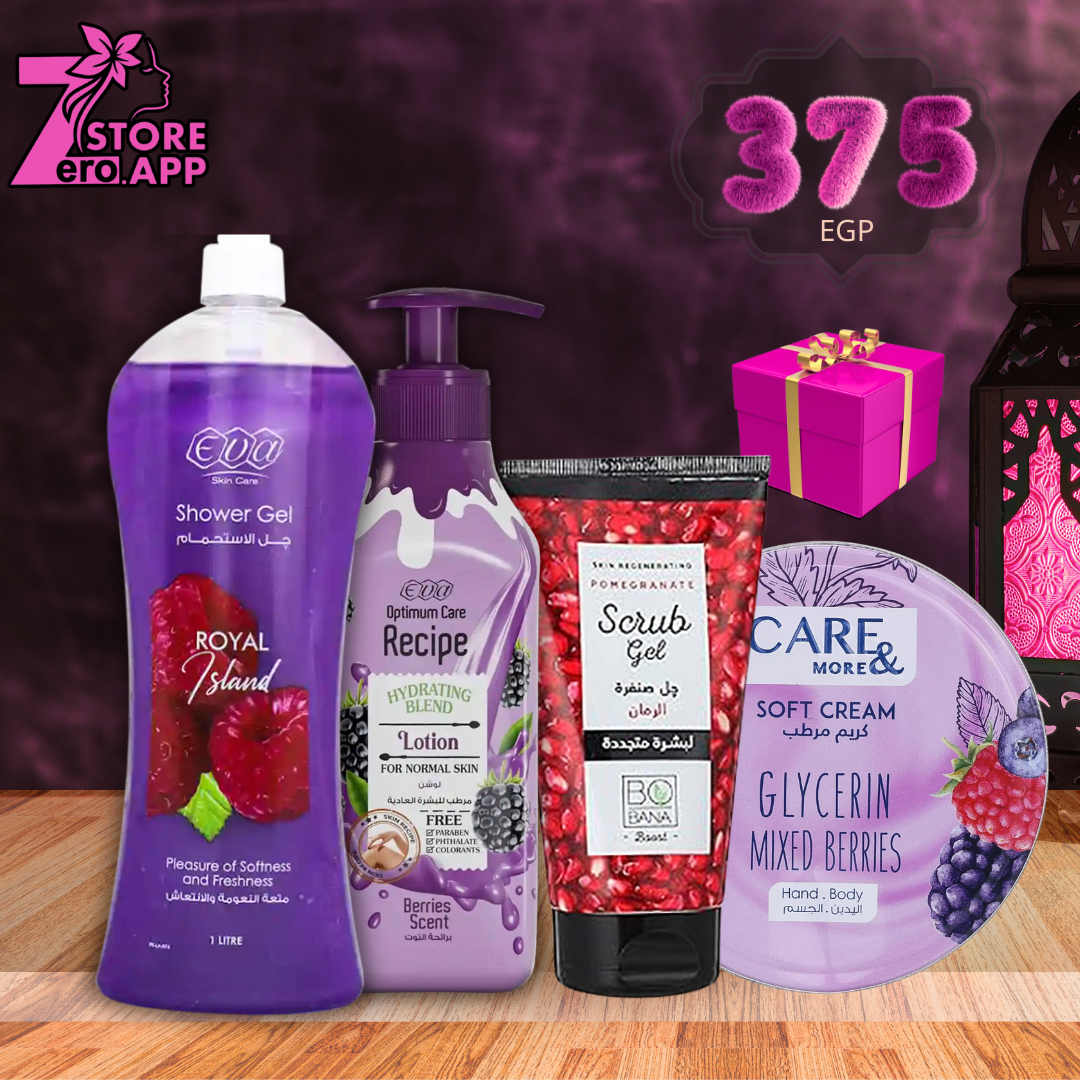 ١-ايفا ريسبي لوشن برائحة التوت ٣٧٠مل ٢- ايفا شاور جيل رويال موف ١ لتر ٣- بوبانا جل صنفرة بالرمان ١٥٠ مل ٤- كير اند مور كريم بشرة توت ٧٥ مل